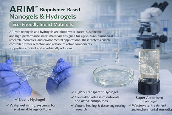 ARIM™ nanogels and hydrogels are biopolymer-based, sustainable, and high-performance smart materials designed for agriculture, biomedical research, cosmetics, and environmental applications. These systems enable controlled water retention and release of active components, supporting efficient and eco-friendly solutions.