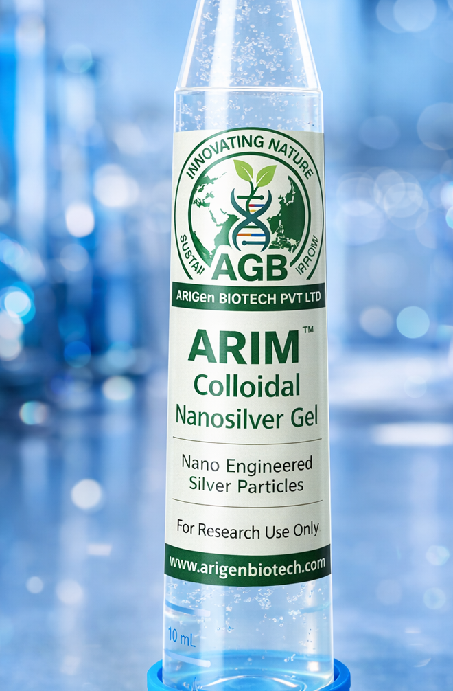ARIM™ Colloidal Nanosilver Gel is a nano-engineered research formulation developed by ARIGen Biotech Pvt. Ltd., designed for advanced oral health research applications. The gel is formulated using stabilized nanosilver particles uniformly dispersed in a transparent gel matrix, ensuring high surface activity and consistent performance.